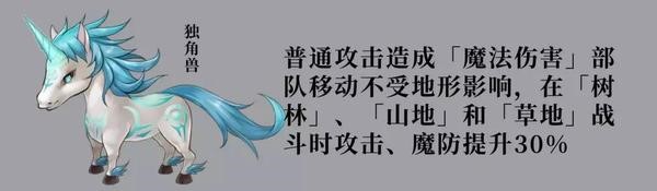 首先让我们来分析一下这个兵种,独角兽想要触发效果,需要普通攻击造成魔法伤害,这个限制看似很严格,但是想要达成也并不是很困难。因为草地是游戏中非常多的一种地形,可以最大限度的享受到兵种带来的效果。如果跟拉姆达的"圣树庇护"一起使用,也可以享受到独角兽树林带来的效果(攻击、魔防提升30%)。而且无视地形的移动是这个兵种最大的受益点。