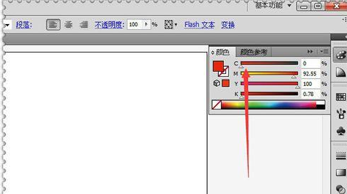 颜色设为红色,单击右边的前景色面板,C行拖动滑块设为红色。