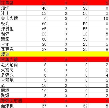 对手枪、步枪、爆破类武器,先减离散,如果减到0就加暴击,修改的总值为10。特别的有冰与火之鹰、红黄蓝冲锋枪,密集火箭发射器和导弹,不会增加暴击。