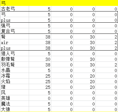 比较特别的是魔法弓和英雄弓,魔法弓的箭自动追踪,不需要调角度所以跟普通弓算法一样;而英雄弓的箭直线飞行,需要缩角度,跟散弹弩一样是归在散弹里的。