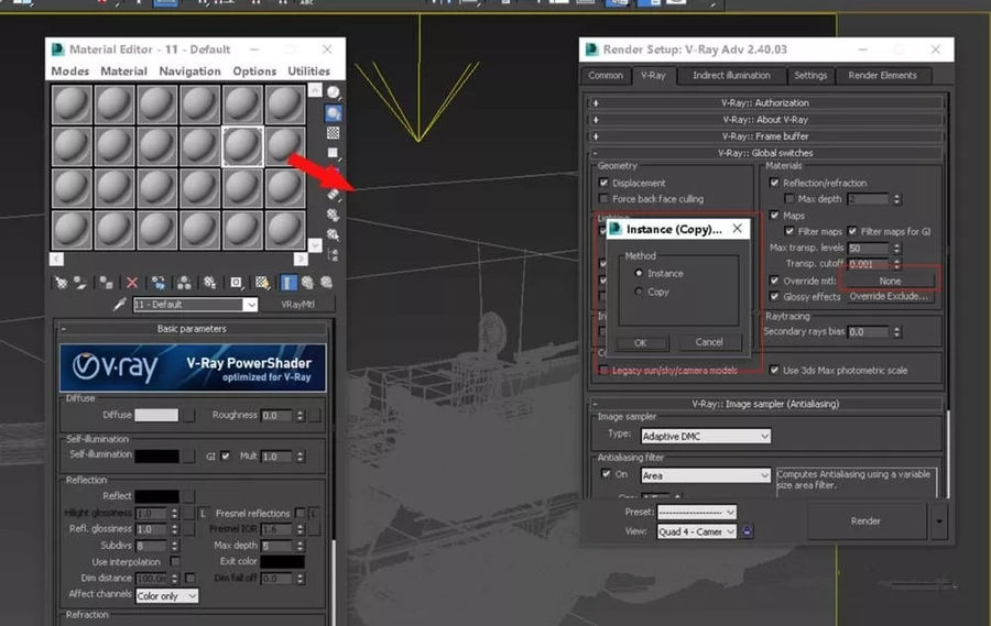 打开VR渲染面板,找到“Overr...”这一栏,关联复制材质球