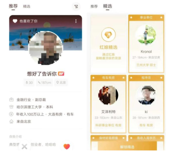 3.而且牵手恋爱“推荐”页卡设置阶梯式门槛,步步引导用户成为付费VIP;“精选”页为用户打上稳定的职位标签和象征财富的“有车有房”标识,吸引用户付费迅速认识对方。