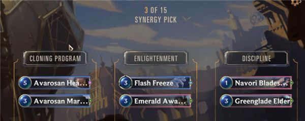 在两个英雄选择的抓位之后,是12个非英雄牌的抓位,由“synergy”和“wild”两种选择交替进行,即6次和你之前的选择有协同作用的卡牌组合三选一,和6次比较“狂野”的和之前没什么联系的卡牌组合三选一,两者交替进行。