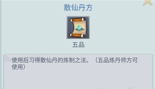 当各位的丹道修为达到五品之后,便可自行炼制散仙丹,各位可以在【坊市】-【珍宝阁】三层中花费10万灵石入手散仙丹方,至于炼制所需的材料和宗门兑换的类型如出一辙。