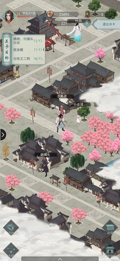 1、揭榜、与捕头对话:我们沿着唯一的一条路走,之后会看到谢捕快和身边的一块木板,在木板前互动揭榜,走到捕头身边完成对话就可以了;