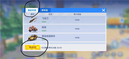 在“我的车辆”页面左下方有一个黄色按钮“找车位”,玩家可以通过该按钮找寻车位。