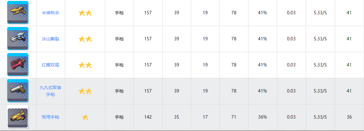 其dps约为238.04%平均气绝量约为272.75,被动是气绝效果提升。作为一把气绝定位的武器其气绝量略高于第二位的群星道标,远低于第一位的指引星辰,从伤害上看这把武器也不如前两者,属于前两者的下位替代品。对于这把武器的被动进行了测试,确定了这把武器对角色技能的气绝效果有加成(需要注意的是气绝效果为技能的隐性固有属性即使没有标明附带的气绝量的伤害型技能也会含有一定的气绝量),但遗憾的是目前手枪并没有技能型的强袭所以效果并不算好,综合来说将这把武器排在第四。