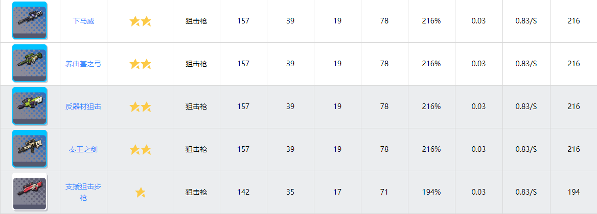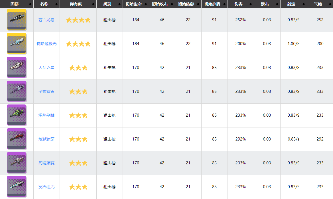 天河之星的平均dps为194.56%平均气绝值约为224.91,将这把武器排在第二主要原因是气绝增加系列的被动可以加成技能的气绝量可以跟当前的狙击卡有较好的互动性。苍白龙息的平均dps约为210.41%平均气绝量约为209.16,这把武器的被动看起来很垃圾实际上还真没啥用,能排在这个位置得益于其作为一把金武器拥有得天独厚的倍率。