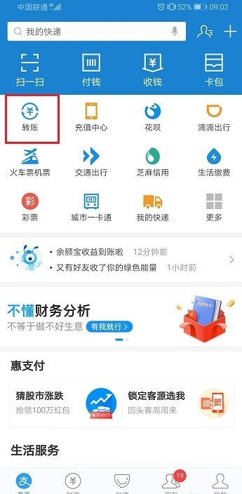 1、点击打开手机的支付宝,点击页面上的转账。
