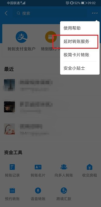 3、选择“延时转账服务”。