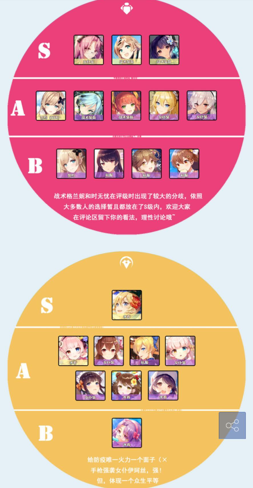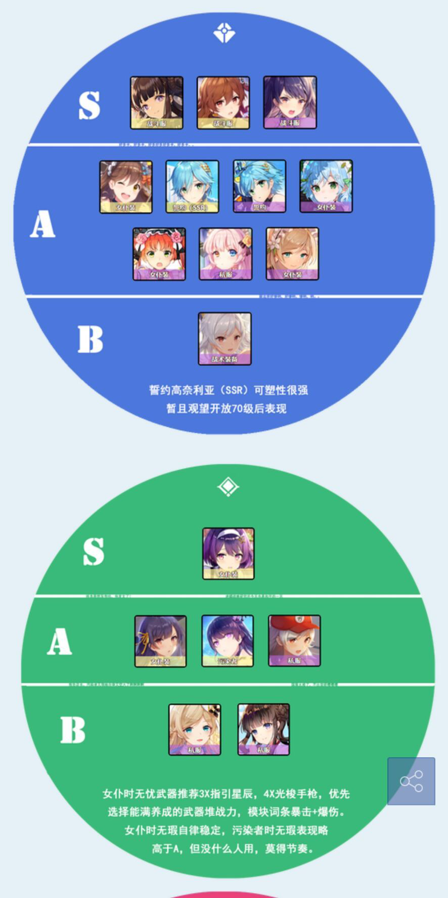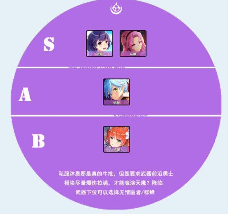 因为这游戏同角色只能一个出战,我玩过日服,所以知道,国服后续会出四星水着朱诺(和私服朱诺冲突),四星睡衣沐恩(和私服沐恩冲突),所以抽到私服朱诺和沐恩的,可以考虑下要不要养。四星最强:战术千姬,战术艾琳,战术格兰尼,女仆无忧,女仆沐恩,水着朱诺,(睡衣装没测试强度,暂且不提)。