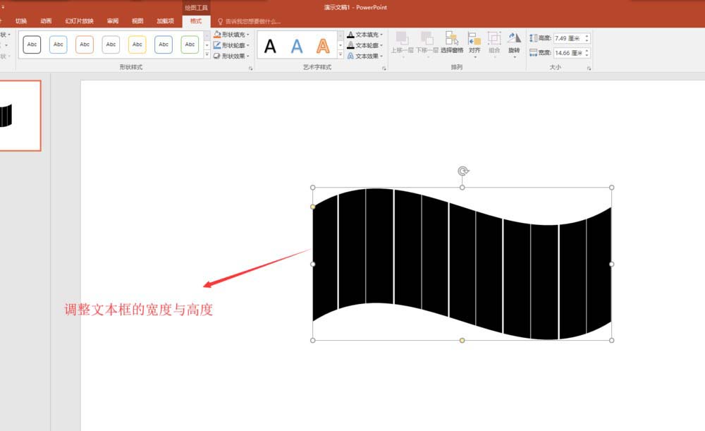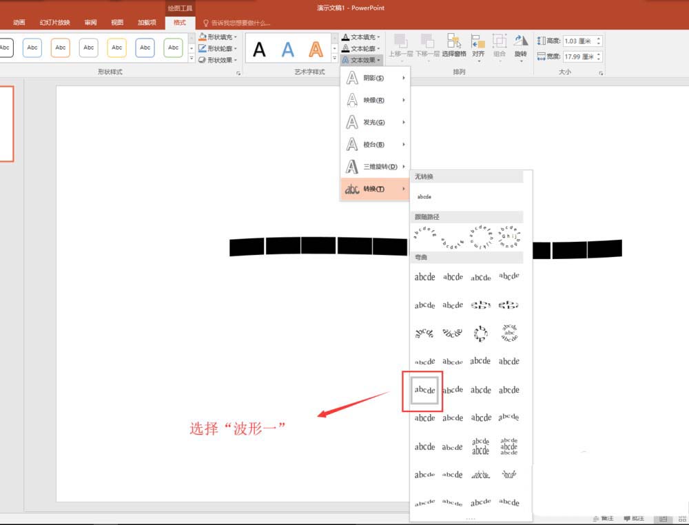 保持选中文本框的状态,切换到格式菜单中,在格式菜单中找到文本效果,在文本效果中找到转换中“波形一”效果,单击应用到文本框的文字内容上。