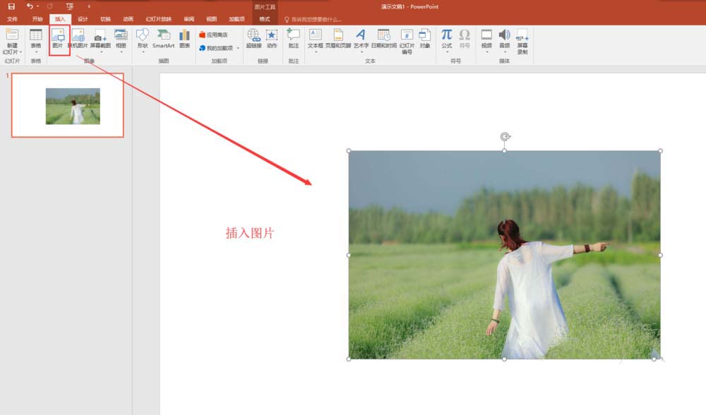 切换到插入菜单栏中,在插入菜单栏中找到图片命令,单击图片弹出插入图片窗口,在插入图片窗口中找到自己要插入的图片,单击插入的幻灯片页中。