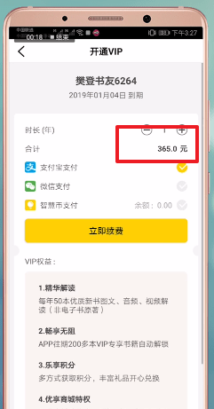 2、接着点击【VIP付费】就可以看到攀登读书会开通vip收费了,都是按年收费的,每年365元