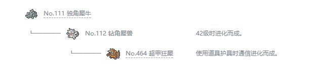 剑版:进化后会变得仅用后脚就能站立。如果被它的角刺中,就连岩石也会被开个洞。