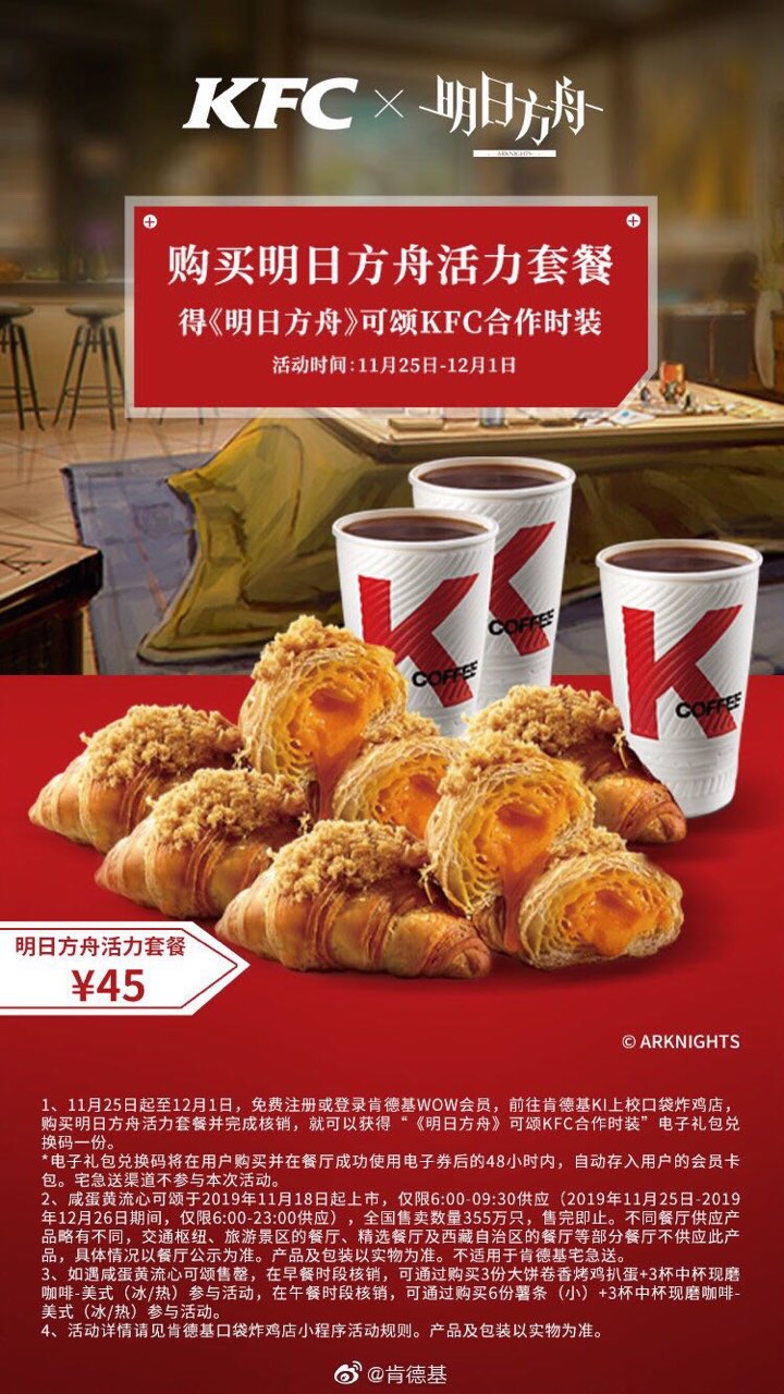 活动说明:活动期间内于KFC口袋炸鸡店购入明日方舟联名套餐,获得指定角色时装[KFC合作系列-清晨七点]。