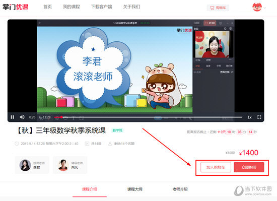 3、进入课程后,用户可以在下方了解课程、课程大纲与老师的介绍,确认之后点击立即购买;选项即可进行购买,购买完成后也就代表报名成功了,如下图所示: