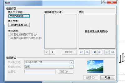 3、在相册的对话框中插入图片来自;文件/磁盘。然后全选图片文件中的所有图片,点击插入。