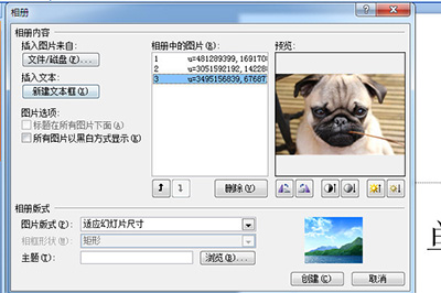 4、之后图片就会导入到对话框中,你可以点击图片列表中的图片调整显示的位置,并在下方设置相册的版式。