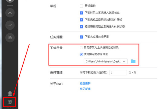1、ENFI下载器作为专业的资源搜索下载软件,此软件不仅可以下载百度网盘上的资源,它还可以搜索并下载网络上的各种资源,其中就包括抖音歌曲、小说、漫画、电影、游戏或视频等内容,用户在下载前,如果想要设置下载存放位置,只需点击左下方的齿轮设置选项,选择使用指定的存储目录;选项,选择合适的播出路径,即可完成下载位置的设置,如下图所示: