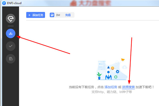 2、接着点击下载;图标回到主界面,软件当前没有下载任务,直接点击其中的资源搜索;选项开始搜索,如下图所示: