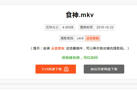 5、出现该链接有效,可以访问的提示后,一种有两种方法可以下载,第一种是前往百度网盘下载,第二种方法是利用ENFI下载器进行高速下载,默认点击Enfi高速下载;选项进行下载,如下图所示: