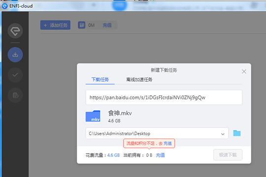 6、ENFI下载器将会自动识别刚刚链接,弹出新建下载任务选项,点击极速下载;选项即可一键下载视频,如下图所示: