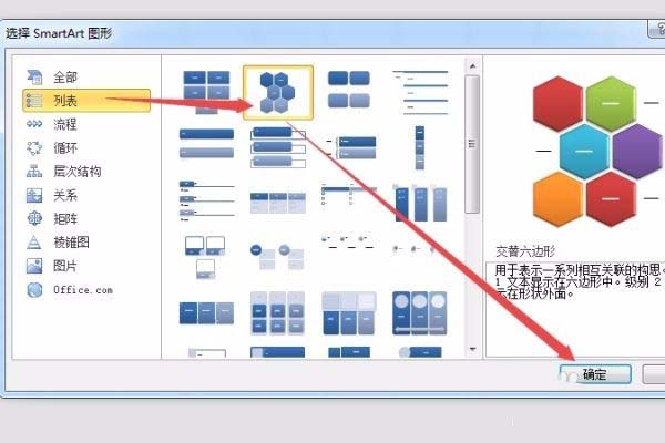 1、新建一个excel工作表,在菜单栏中的插入中,找【smartart】命令单击【列表】,选择【交替六边形】后单击【确定】