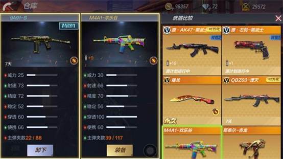 如图,9A91-S和橙色品质的M4A1-欢乐谷相比,前者射速、精度、便携强于后者,威力、稳定、穿透和主弹夹数低于后者,即:论输出精度、压制性,前者占优;论伤害、续航时间,后者占优。