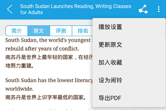 5、进入到此文章界面,大家可以在其中查看简介、原文等内容,你还可以点击右上角的设置;选项,进行播放设置、更新原文、加入收藏、设为闹铃或导出PDF操作,如下图所示:
