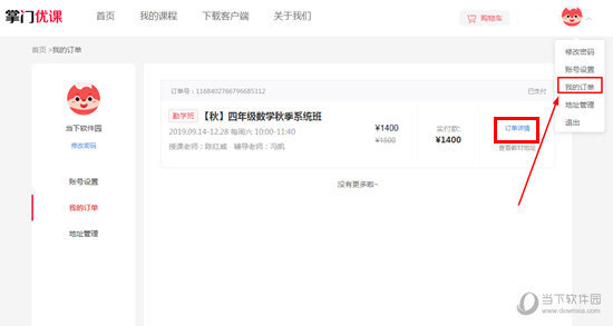 1、首先需要在掌门优客客户端进入到掌门优客的官网,成功进入到官网后,点击右上方的图标选项,选择其中的我的订单;选项,接着在我的订单中看到之前所下的订单,选择订单详情;选项,如下图所示:
