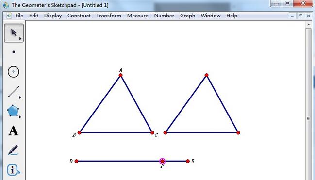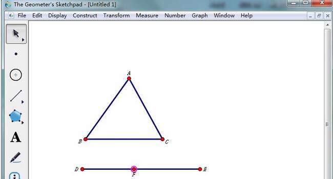 1.打开数学课件制作工具几何画板,新建一个空白文件,在工作区中画一个△ABC,另画一条线段DE,在DE 上画一个点F;