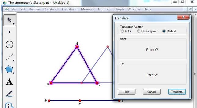 4.结果如下图所示,你可以拖动点 F 在 DE 上移动,控制ΔA′B′C′离开△ABC 或与△ABC 重合,制作基本完成,但下面我们再做一些优化工作;
