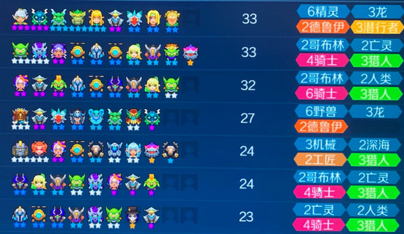 6精灵3龙3潜,6精灵4野兽3潜,个人认为前者更强势,因为小精灵龙的加强,团队护盾收益很大。阵容如上图 至于没用风刃骑士,而用穿林之风,个人喜好。