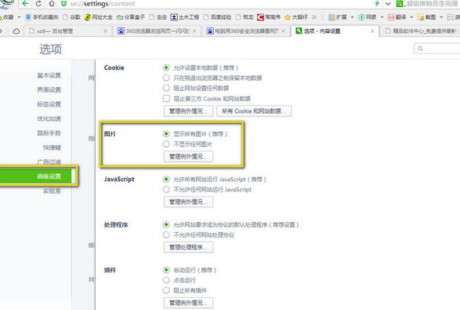 在高级设置中找到“网页设置”,在网页设置里(勾除)不显示图片