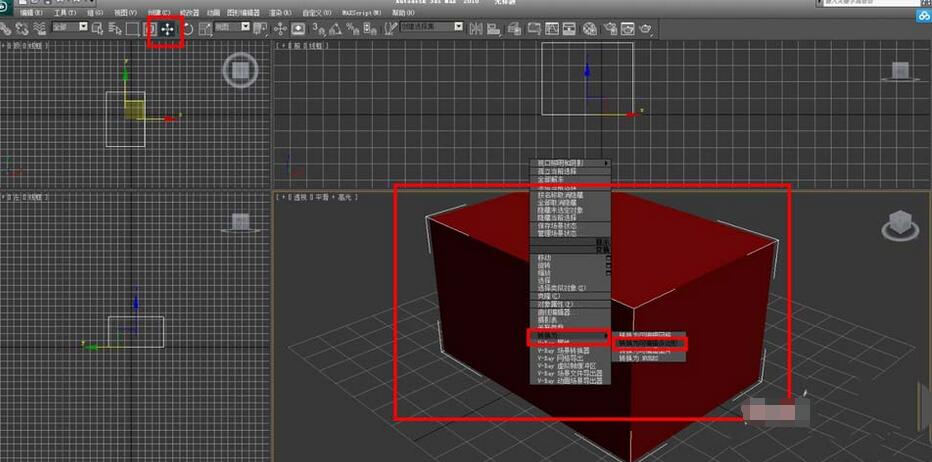 用移动工具选中长方体,右击鼠标,把长方体转化成可编辑多边形
