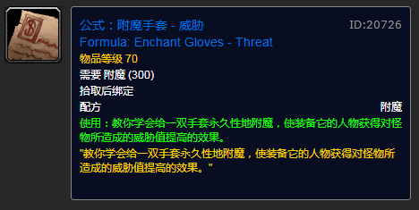 使用:教你学会给一双手套永久性地附魔,使装备它的人物获得对怪物所造成的威胁值提高的效果。
