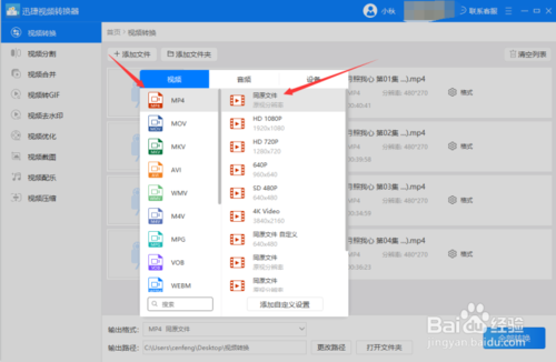 2、2、随后要设置好视频的输出格式,输出格式又分为视频格式和视频分辨率,因为要把视频转换成mp4格式,所以把输出的视频格式设置为mp4格式,分辨率一般则设置为和原视频相同的同原文件格式。