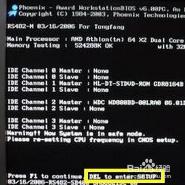 打开计算机电源,或重启电脑,当电脑出现第一屏幕时,立刻按键盘上的“DEL”或“delete”键进入bios(笔记本是F2或其他键进bios),为了避免错过短暂的几秒时机,你可以在刚开机时就不停的按del键。如下图: