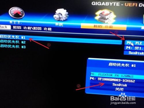 ②点击进入“bios功能”,如下图箭头1,再点击进入“硬盘设备优先权”,如下图箭头2(可以用鼠标操作,也可以用键盘的方向键与回车键操作):