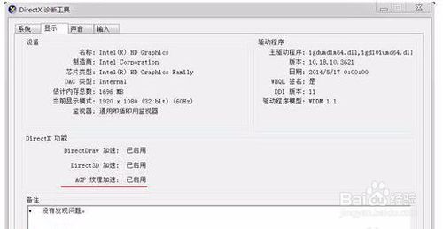 如果:DitectDraw加速、Ditect3D加速、AGP纹理加速三项已启动或者能启动,就说明显卡驱动安装适合计算机,反之则说明显卡驱动安装不合适,必须更新或者更改显卡驱动