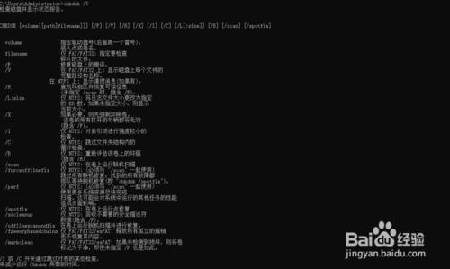 3、在命令行中输入chkdsk/?,点击回车键查看与该命令所有相关的功能。