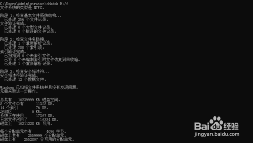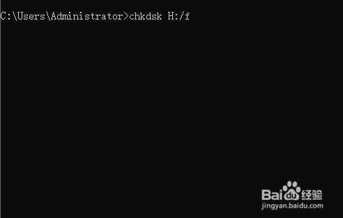 4、我们尝试修复磁盘的错误来修复该U盘,输入chkdsk H:/f,其中H:是U盘的盘符,是我们在步骤1中让大家记下来的,点击回车键。