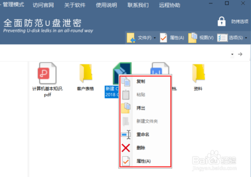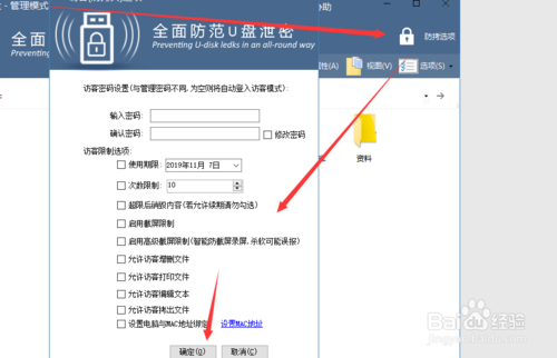 10、在右上角找到管理模式下才有的防拷选项,在这里可以设置该U盘的其他功能和普通模式下的权限,根据需要勾选设置即可,最后点击确定。