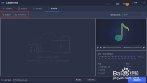 1、1、首先我们在要在自己的电脑下载并安装这款音频转换软件,启动这款软件,进入软件界面后,我们点击界面中的“添加文件”或者是“添加文件夹”将所需要转换的音频格式文件给导入进来
