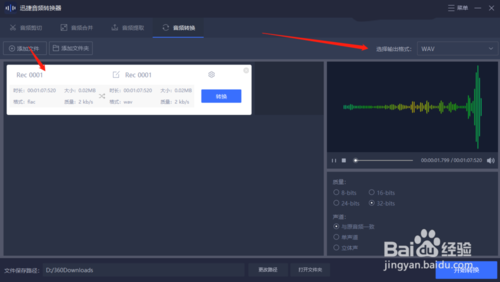 2、1、音频导入进来以后,我们需要设置音频的输出格式,在“选择输出格式”选项框内有五种音频格式可供我们选择,分别是wav、flac、mp3、aac、ogg。大家根据自己转换的需求选择相应的输出格式即可