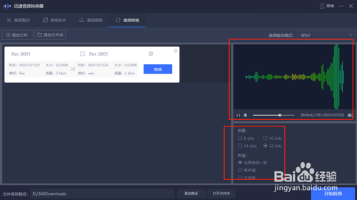 5、5、最后我们就可以转换自己编辑好的音频文件了,在软件的右下方有一个“开始转换”的按钮,点击这个按钮我们的音频文件就可以转换音频格式了。转换好的音频文件就可以在自己选择好的音频文件保存路径中找到了