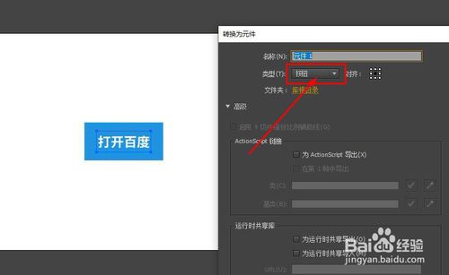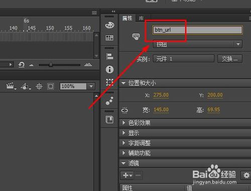 5、选择按钮元件,在属性面板设置按钮实例名为btn_url
