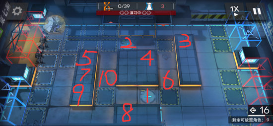 8、在8号放置单体术师,朝上,待护盾敌人出现后将2号先锋换成重装,血量不能高于6号。