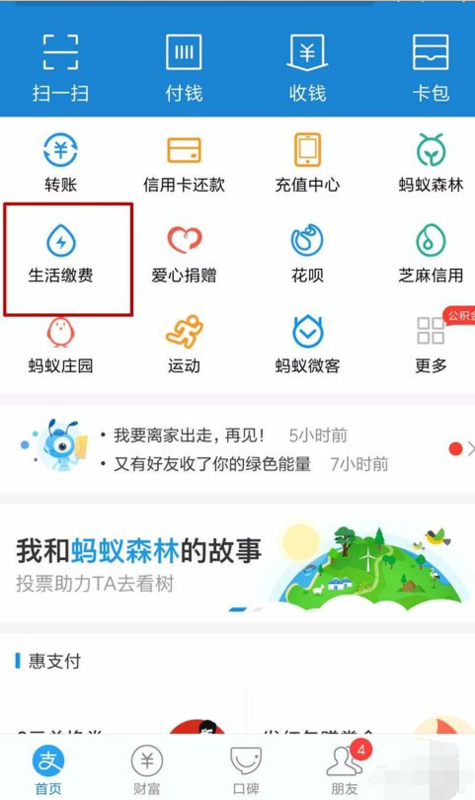 1、点击打开支付宝,然后点击页面上的“生活缴费”。